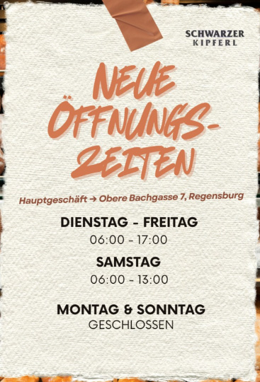 Aufgrund des anhaltenden Personalmangels sind wir gezwungen unsere Bäckerei auf eine 5 Tage-Woche umzustellen.